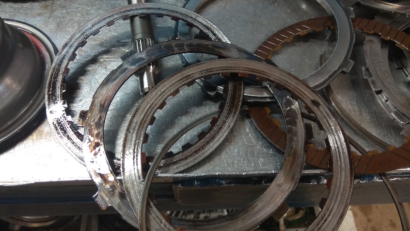 Εδώ βλέπουμε δίσκους καμένους που έχει καεί τελείως το υλικό τριβής , αυτοί με τα εσωτερικά δόντια και τους αντίστοιχους μεταλλικούς με τα λίγα εξωτερικά δόντια με μαύρα σημάδια υπερθέρμανσης.